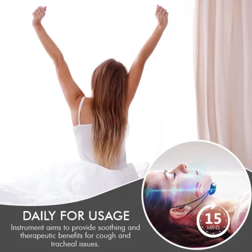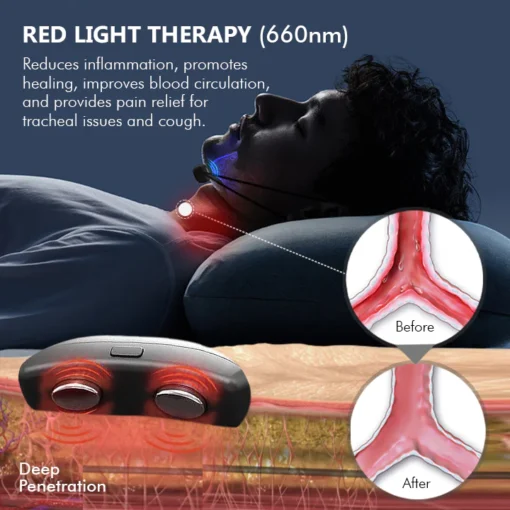This device targets the root causes of coughing and tracheal discomfort to improve breathing. It soothes the trachea and supports healing, indirectly enhancing breathing. It reduces inflammation, eases pain, and aids tissue repair, creating a more comfortable tracheal environment. As the trachea heals and irritation lessens, airflow becomes smoother, improving breathing.