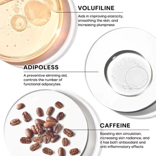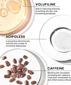 Adipoless, Volufiline, Aqua, Grape Seed Oil, Patented Glucose Complex, Vitamin C,Mangosteen, Algae & Quince