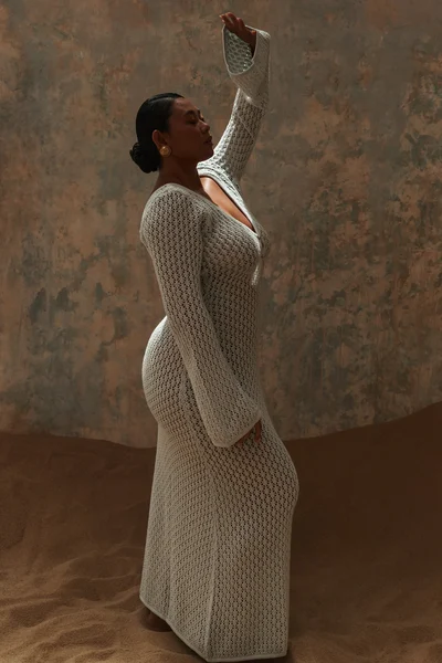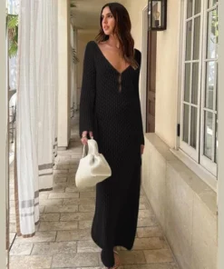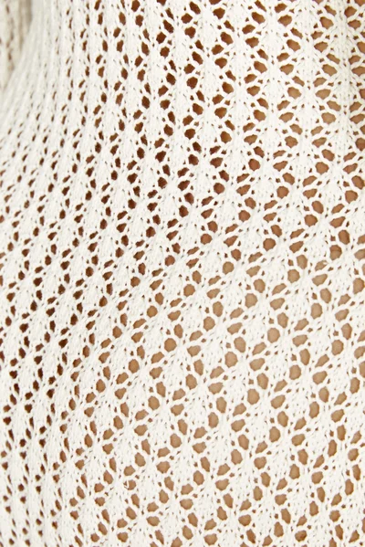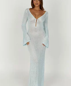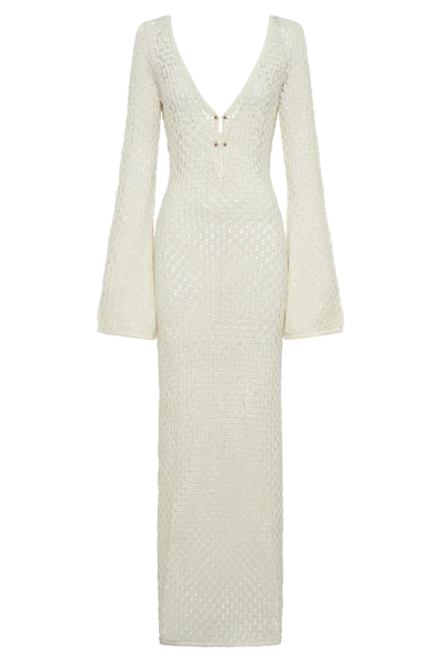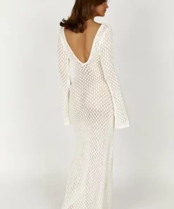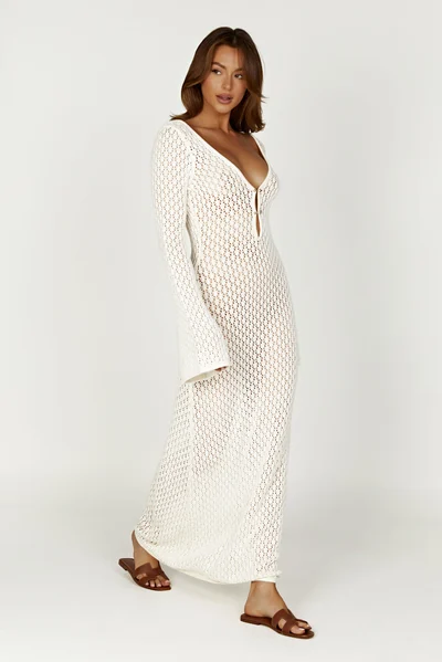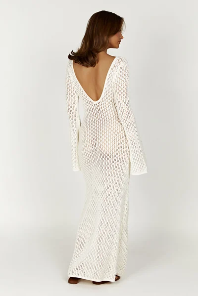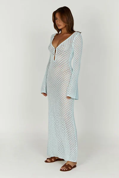 This is a crochet maxi dress with flared sleeves, a deep V-neckline, and a deep, rounded V-neckline at the back. There are two keyhole cut-outs in the front centre fastened with two MESHKI gold bar hardwares for a little extra bling. The long, flared sleeves and raw, floor-sweeping hem add full-coverage drama without looking overdone. The see-through, mesh-like fabrication is spun from an acrylic-and-cotton fabric blend for optimal comfort.