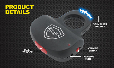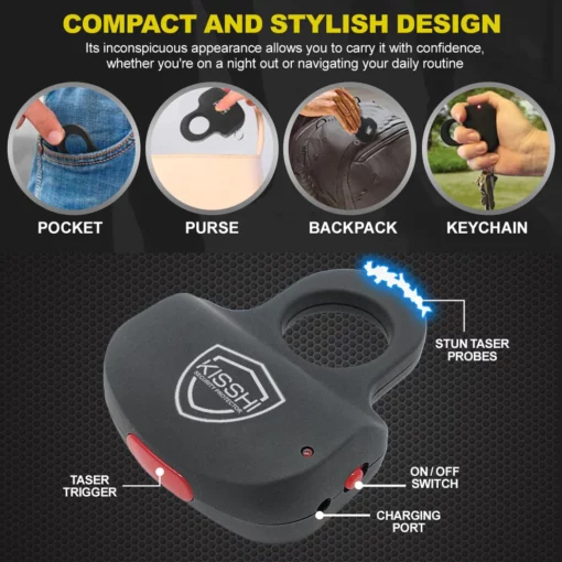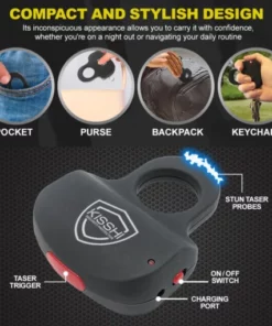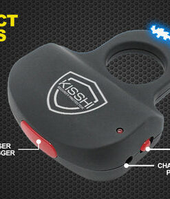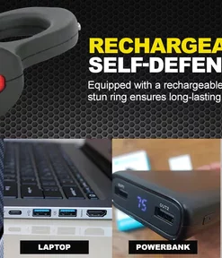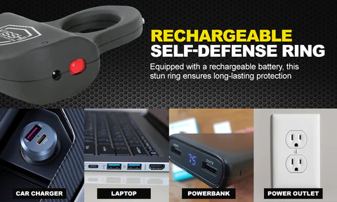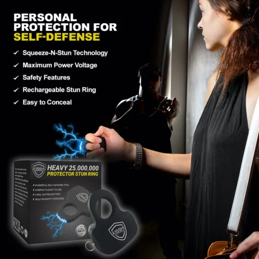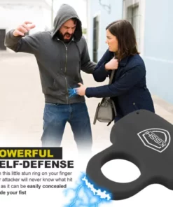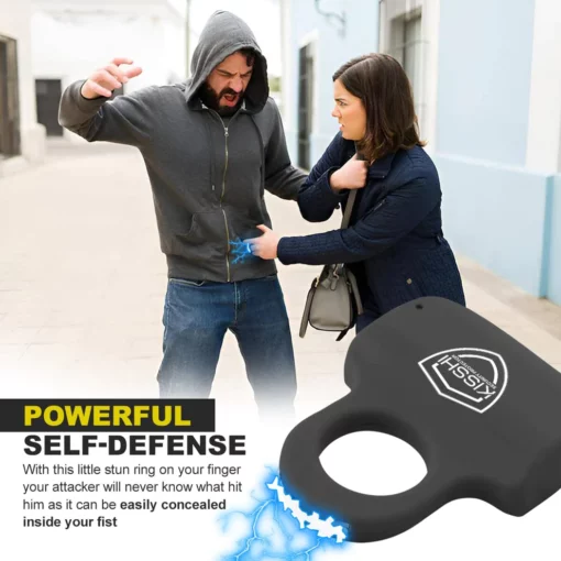 Instead of fumbling around looking for the right buttons to push, you simply tighten your grip to activate the electricity on top of the rings and stun your attacker!