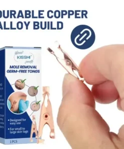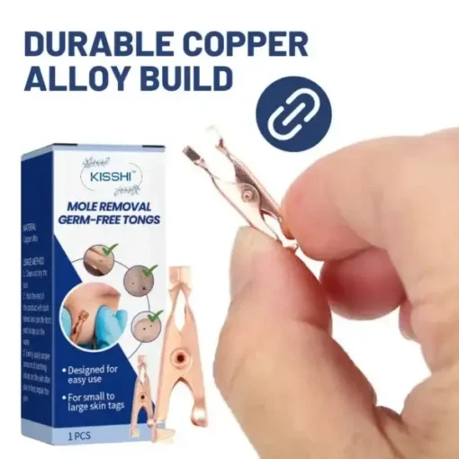 KISSHI™ Mole Removal Germ-Free Tongs utilize an advanced spring clip mechanism to remove skin tags and warts effectively. The tongs apply gentle pressure, cutting off the blood supply to the growth, which causes it to dry out and fall off. Made of durable copper alloy, the product ensures safe, hygienic, and long-lasting use.