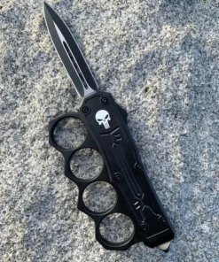 The Knuckles OTF Knife is one of a kind and is the meanest knuckle knife you will ever see! Fully functional, double action OTF knife with a 440C spear point style blade. With a heavy duty zinc alloy handle, you will love the toughness of this knife. Includes a glass breaker, pocket clip and nylon sheath.