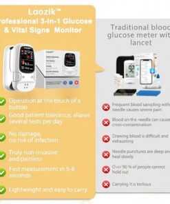 Laozik™’s latest innovation, the multifunctional non-invasive laser glucometer, integrates cutting-edge technologies for superior health monitoring. Equipped with a low-energy smart control chip and utilizing the advanced ‘LAMBERT BEER’ algorithm, this device ensures highly accurate measurements. It combines photon chip technology and silicon with light absorption spectroscopy to provide reliable, non-invasive monitoring of blood glucose, blood pressure, and blood oxygen levels. Certified by Health Canada, the device includes six display functions for easy and comprehensive health tracking. Whether you’re managing diabetes, monitoring cardiovascular health, or tracking oxygen levels, Laozik™ offers a reliable, all-in-one solution for your health needs.