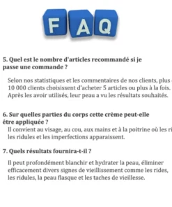 Suggestion : Utilisez-la deux fois par jour et n’interrompez pas son utilisation pour ne pas affecter les résultats finaux. Selon nos données de recherche et les commentaires des clients, l’effet est le plus évident à la cinquième semaine d’utilisation. Plus de 10 000 clients ont signalé qu’il est préférable d’acheter 5 pots ou plus à la fois au cas où il y aurait une interruption d’utilisation qui pourrait affecter les résultats en raison de la longue durée de livraison et du processus logistique entre les commandes.