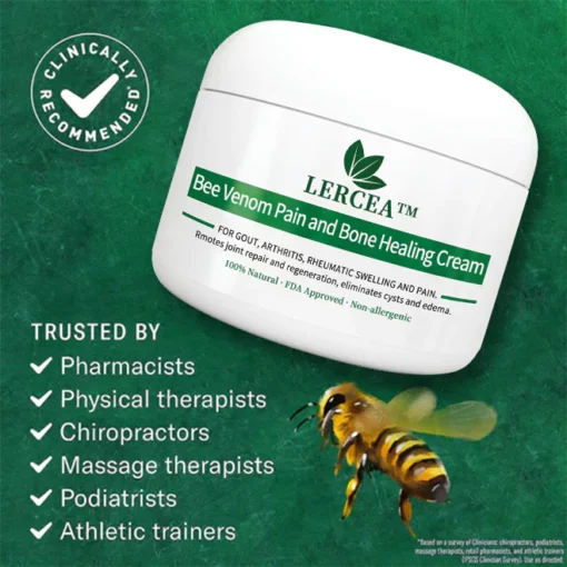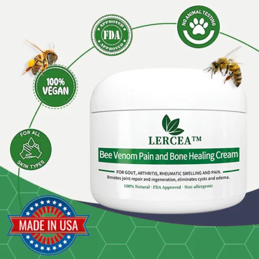 LERCEA™ Bee Venom Pain and Bone Healing Cream enthält sechs leistungsstarke und bewährte Inhaltsstoffe, die weltweit bei Millionen von Menschen erfolgreich zur Behandlung von Arthritis und knochenbezogenen Erkrankungen eingesetzt wurden.