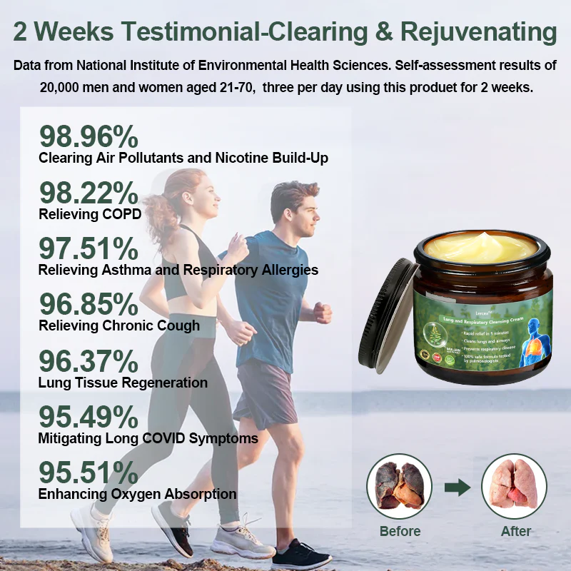 In a 28-day clinical trial with 2,572 participants worldwide, Lercea™ Mullein Clear Lung Repair Cream demonstrated remarkable effects in cleansing and regenerating the lungs of individuals exposed to long-term smoking or dust inhalation. Key findings included: