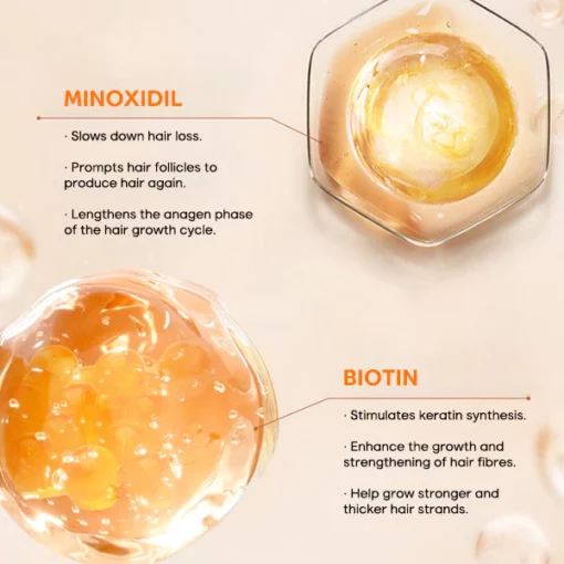 2. Biotin (Vitamin B7): Biotin is instrumental in maintaining hair health as it fortifies the keratin structure—the protein that hair is made of. This strengthens the hair and minimizes hair loss. Biotin also plays a key role in nutrient breakdown, providing the necessary nourishment for hair growth. Its inclusion in hair regrowth formulas is essential, as Biotin deficiency can lead to hair thinning.