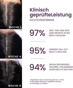 Ergebnisse nach Anwendung der Kur (einschließlich Liascy™ Flourish Haar-Dichtheitsspray) in einer doppelblinden, unabhängigen, 6-monatigen klinischen Drittstudie mit 30 Frauen. 97 % der Frauen sahen nach 3 Monaten neues Haarwachstum, 94 % sahen nach 2 Monaten gesünderes, volleres und voluminöseres Haar und 95 % sahen nach 2 Wochen weniger Haarausfall.