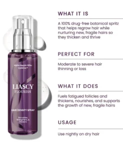 Liascy™Flourish Hair Density Spray combined with 3 powerful ingredients. Clinically proven to thicken, strengthen, and repair hair while balancing the scalp and creating an optimal environment for growth.