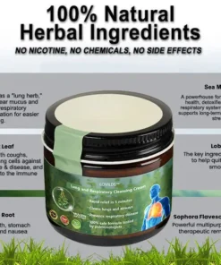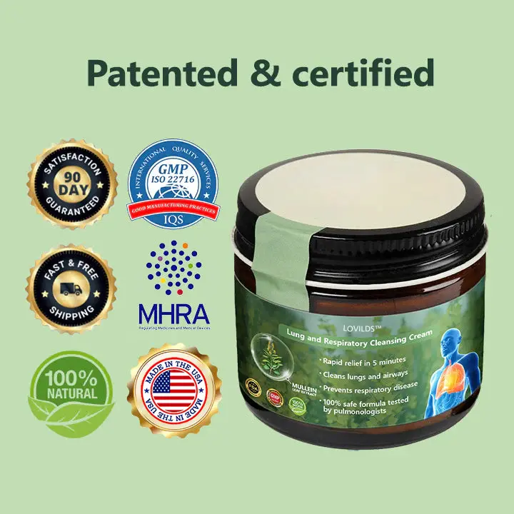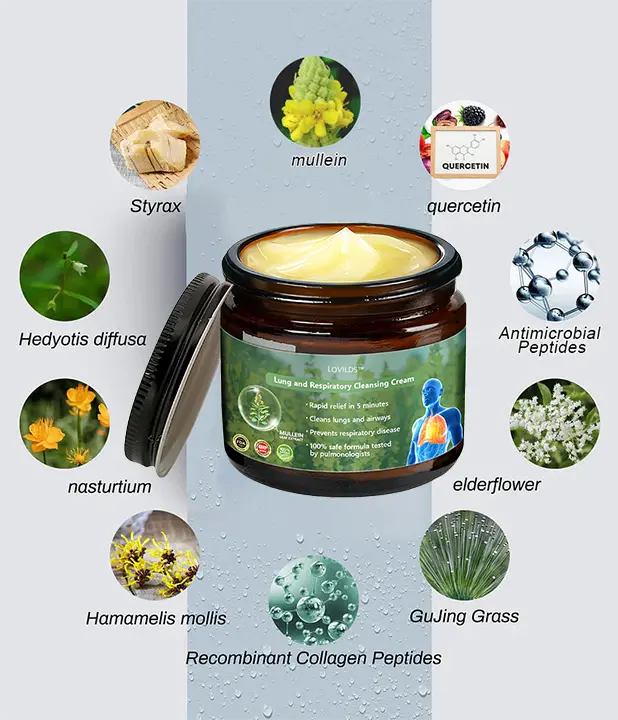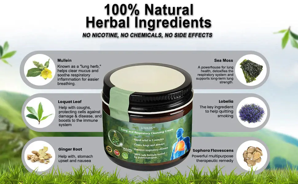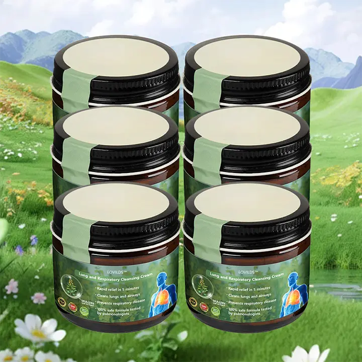 Our LOVILDS™ Cow’s Lungwort Clear Lung Repair Cream combines six powerful natural ingredients that work together to provide comprehensive lung support and detoxification, making it particularly suitable for those facing respiratory problems or wishing to quit smoking.