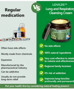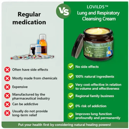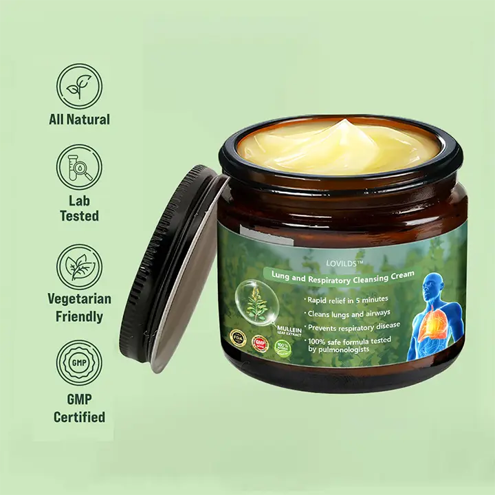 We designed it as a lung-clearing cream for convenience. Compared to drops or capsules, LOVILDS™ Herbal Lung Repair Cream is portable and ready to use, making it ideal for modern, fast-paced lifestyles. Additionally, application allows the ingredients to be released gradually, providing ongoing benefits rather than absorbing them all at once – which is especially beneficial for managing chronic respiratory problems. Our product is made with natural herbal ingredients and smells faintly of fresh grass, while also effectively moisturizing the lungs.
