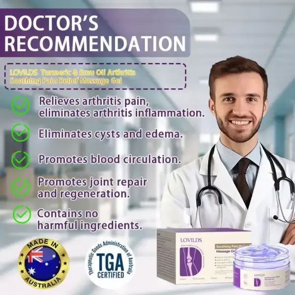 Approved by orthopedic specialists, LOVILDS™ Turmeric & Emu Oil Arthritis Pain Relief Massage Gel delivers fast relief, soothing pain in just 3 minutes. It restores joint mobility within 3 days and supports full arthritis recovery in just 7 days. Formulated with natural anti-inflammatory ingredients like organic turmeric and pure emu oil, this gel penetrates deeply to reduce inflammation, lubricate joints, and promote long-term healing. Clinically proven and easy to use, it’s the ultimate solution for arthritis sufferers seeking quick relief and lasting recovery.