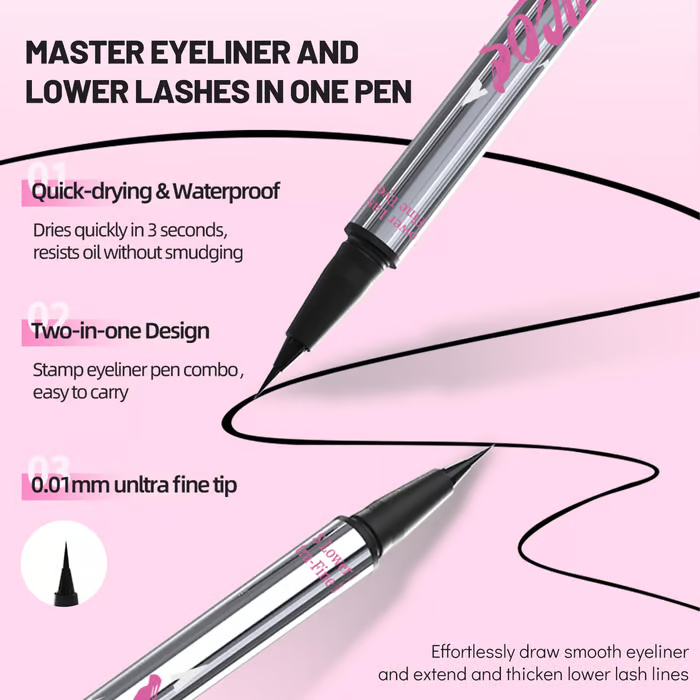 This dual-function design combines both eyeliner and lower lash stamps into a single tool, saving you time and effort. The 0.01mm tip offers precision and the ability to draw fine, delicate lines, while the lower lash stamp perfectly defines your lashes with just one press. The stamps are designed to fit both left and right eyes, ensuring a symmetrical and natural look.