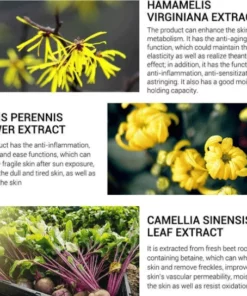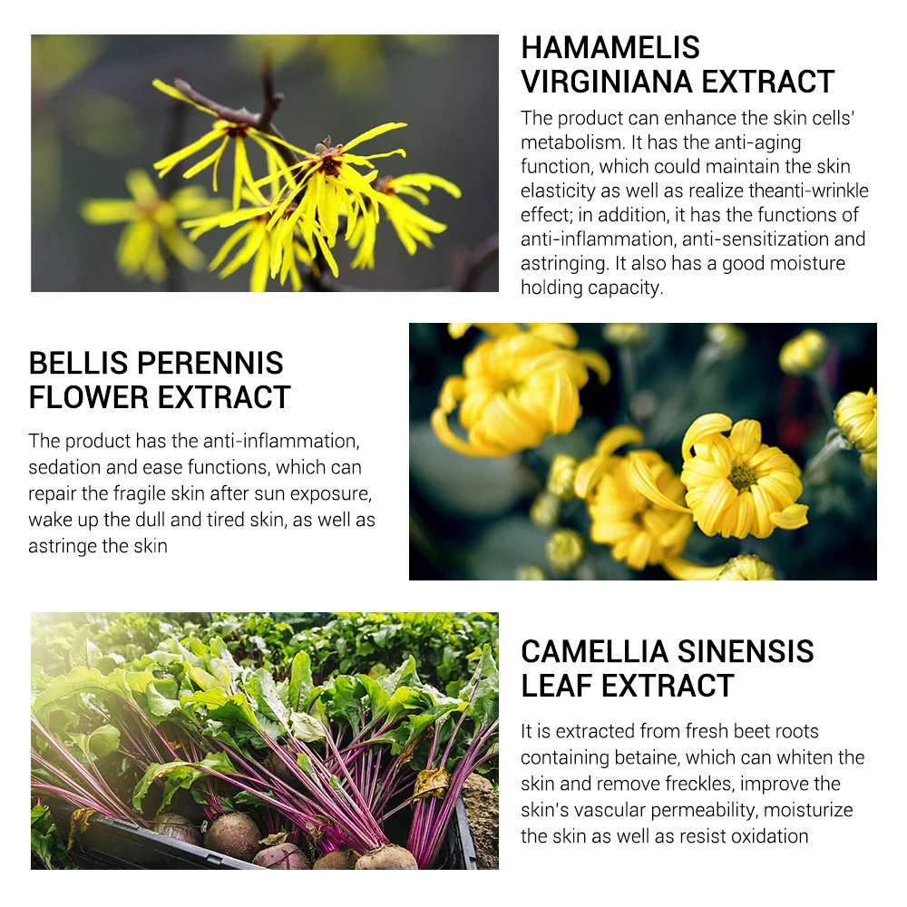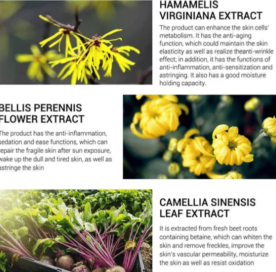 - –BELLIS PERENNIS FL .OWER EXTRACT The product has the anti- inflammation, sedation and ease functions, which can repair the fragile skin after sun exposure, wake up the dull and tired skin, as well as astringe the skin