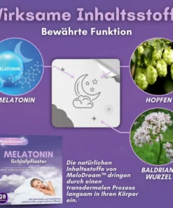MeloDream™ nutzt die Kraft seiner natürlichen Elemente wie Melatonin, Hopfen und Baldrianwurzel, um Körper und Geist sanft zu beruhigen, die Entspannung zu fördern und den Weg für einen tiefen, erholsamen Schlaf zu ebnen.