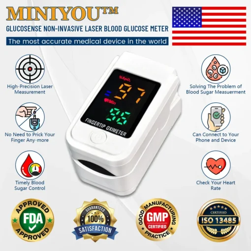 The Miniyou™ GlucoSense Non-Invasive Laser Blood Glucose Meter is FDA certified and also holds CE and CFDA certifications, ensuring the safety and reliability of the device. Made with American technology, it delivers fast and accurate test results.