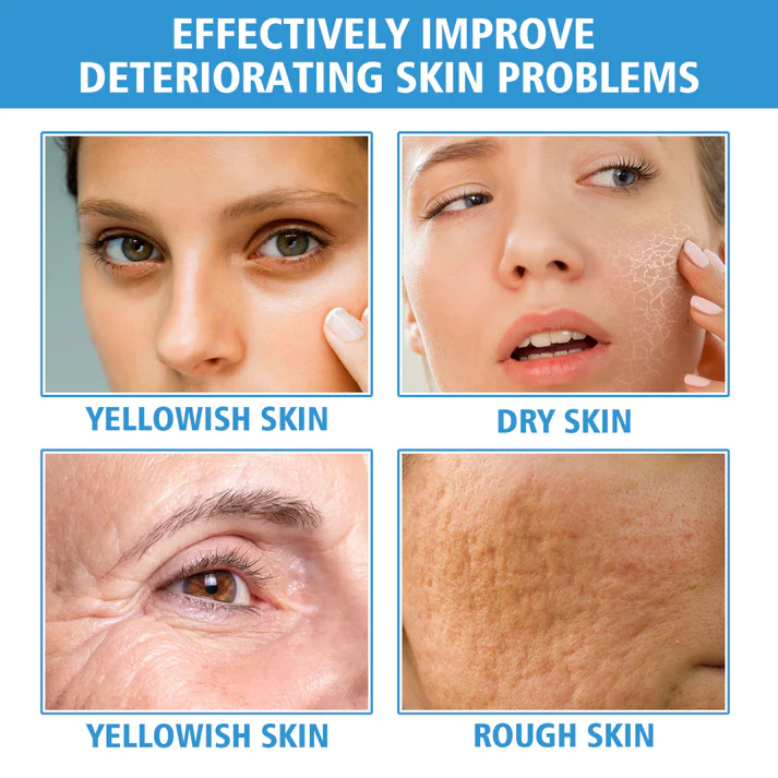 The production of collagen, hyaluronic acid, and ceramides begins to decrease as you age, with an even greater decline in your 30s. Your skin begins to age with wrinkles, dryness, uneven skin tone and loss of firmness due to external environmental stimuli and damages, such as UV radiation, oxidative stress, air pollution, temperature changes, malnutrition, tobacco, alcohol, mental stress, etc., which cause damage to the skin’s immune function, antioxidant capacity, metabolism, collagen synthesis, elastin fibers quality, barrier function, subcutaneous fat storage, etc., resulting in skin discoloration, inflammation, sensitivity, dryness, roughness, and skin pigmentation, inflammation, sensitivity, dryness, roughness, and skin tattooing. and other aspects of the damage to the skin, so that skin discoloration, inflammation, sensitivity, dryness, roughness and wrinkles.