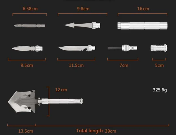 Unique Handle Lock and Instant Swith Shovel Head Design – This shovel has extension bars and handle lock, thus the length of the handle is adjustable according to your needs and there’s no need to worry about the handle getting loose. The shovel head has an instant switch button which allow to change the angle of the shovel head quickly. It also features a regular shovel doesn’t even have: Saw, Bottle Opener, Hoe, Hook, Safety Hammer, Whistle, Belt Cutter.