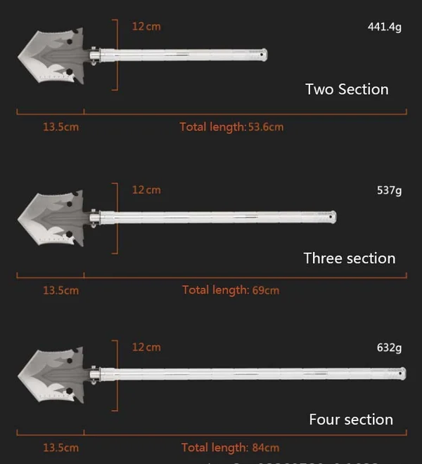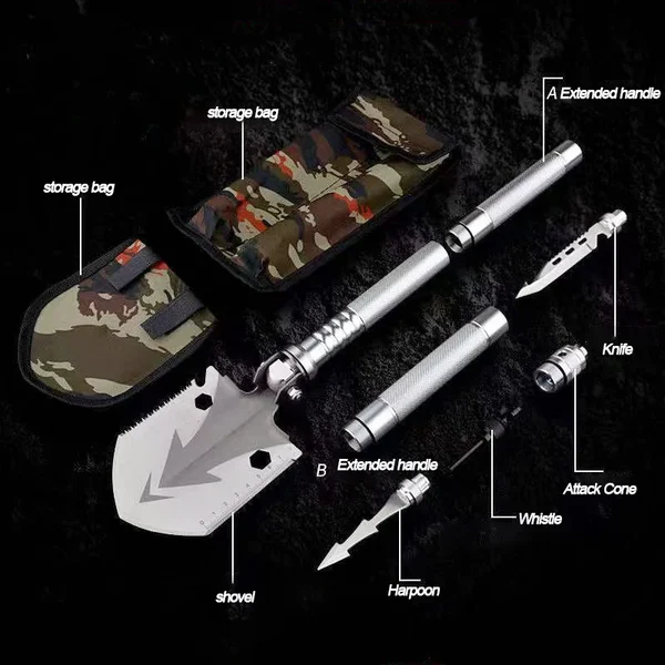 Survival Shovel Made from Strong Material – The shovel head is made of steel, the handle and extension bars are made of Aluminum Alloy. Designed and produced with the sports and outdoor enthusiast in mind. This collapsible tool is an excellent entrenching tool suitable to use in camping or hiking.