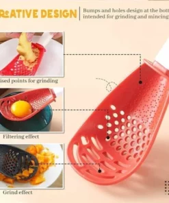 The Multifunctional Kitchen Cooking Spoon can be used for cooking, draining, mashing, and grating garlic. It can be used for mashing potatoes or beans. It also functions as an eggbeater.