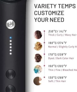 A: It has 5 heat settings (266℉ – 392℉), which are easily selectable and can be adjusted to individual needs. No matter what hair type you have, even the thick and frizzy locks, you can always find the right setting to tame it.