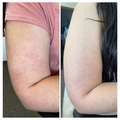 Keratosis Pilaris (KP) is a prevalent skin condition marked by the presence of small, rough bumps that are usually red or white. These bumps commonly appear on areas like the upper arms, thighs, cheeks, and buttocks. The condition arises from an overproduction of keratin, a protein that clogs hair follicles and results in the formation of these tiny, raised spots.