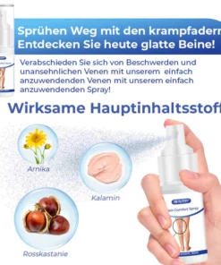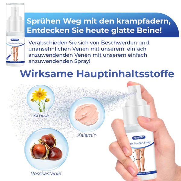 Unser Venen-Komfort-Spray wurde entwickelt, um die Gesundheit Ihres Kreislaufsystems zu verbessern. Es erreicht dies, indem es Ihren Venen und Arterien hilft, flexibel und stark zu bleiben. Das Erscheinungsbild von Krampfadern und Besenreisern auf Ihrer Haut wird durch dieses innovative Bio-Produkt deutlich gemindert.