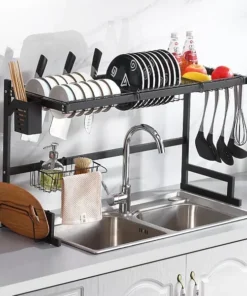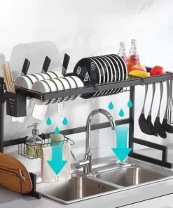 A chic and tidy kitchen! Hanging Basket – The hanging dish drying rack can be freely combined on the vertical bar to create more vertical storage space above the sink without taking up counter space or obstructing the view from the window. Water automatically falls into the sink.