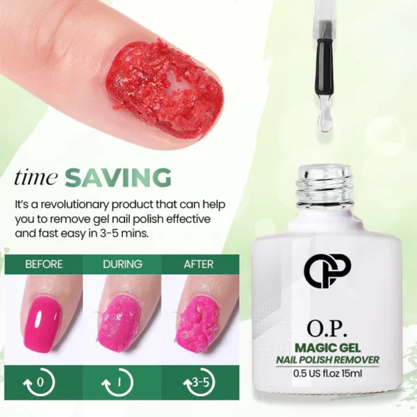 - Convenience in a Bottle: We know life can get hectic, which is why O.P. Magic Gel is designed to make your nail care routine as convenient as possible. The easy-to-use bottle ensures precise application, so you can swiftly remove your polish anytime, anywhere. No more messy spills or wasted product—just pure convenience in a bottle.