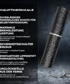 Es ist kein Geheimnis, dass persönliche Sicherheit ein Anliegen für Frauen ist, aber traditionelle Selbstverteidigungsmethoden wie Pfefferspray oder Mace können sperrig und unpraktisch sein, um herumzutragen. Wer möchte schon mit etwas herumlaufen, das schreit: “Ich trage eine Waffe!”? Wir präsentieren den Oveallgo™ 60.000.000 ThunderLip Betäubenden Lippenstift! Die perfekte Lösung für Frauen, die eine einfache und bequeme Möglichkeit zur Selbstverteidigung suchen. Diese mächtige Waffe ist als großer Lippenstift getarnt, sodass sie leicht zu verbergen und überallhin mitzunehmen ist. Ein Betäubender Lippenstift kann einen starken elektrischen Schock an einen Angreifer abgeben, Schmerzen, Muskelkrämpfe und vorübergehende Immobilisierung verursachen. Er kann auch helles Licht aussenden, das dazu verwendet werden kann, dunkle Bereiche zu beleuchten oder einen Angreifer zu blenden. Es ist eine intelligente und stilvolle Möglichkeit, sich vor Schaden zu schützen.