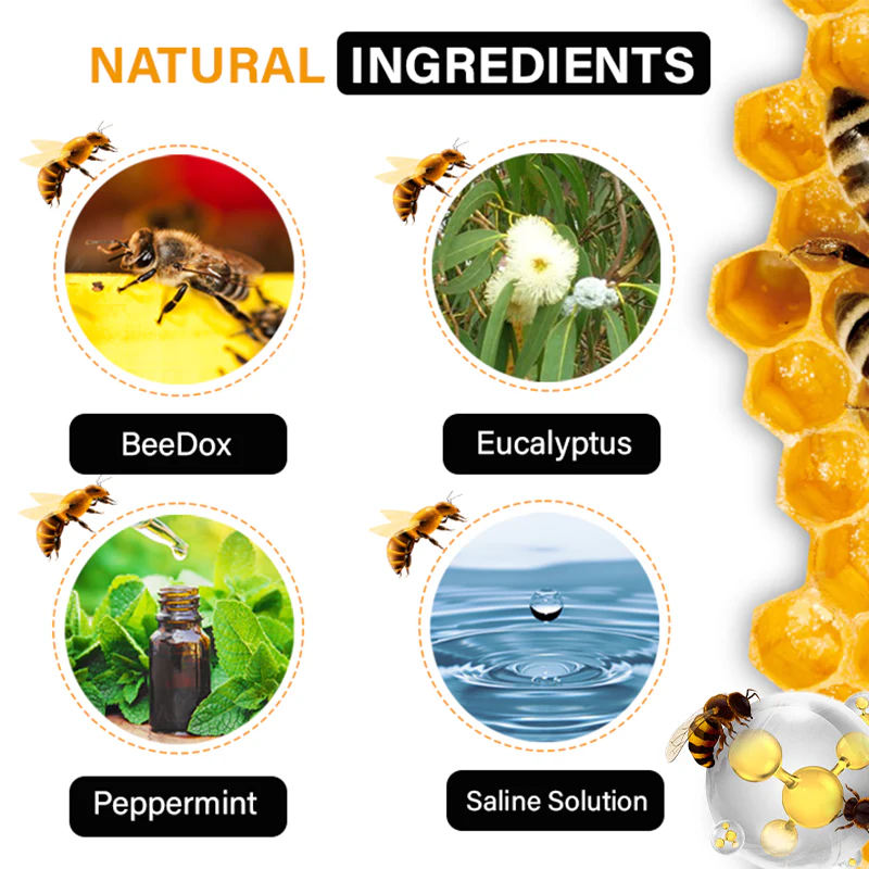 - Ingredients: BeeDox, Eucalyptus, Saline Solution, Peppermint