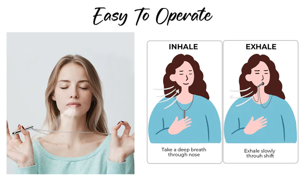 - Ausatmen – Kontrollieren Sie langsam Ihre Ausatmung durch die Halskette, um etwaige Angstgefühle oder Heißhungerattacken, die durch den Nikotinentzug entstehen, zu lindern.