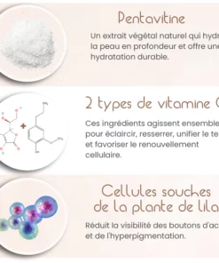 - 2 types de vitamine C : acide ascorbique (forme pure) + THD (forme soluble dans l’huile) agissent ensemble pour cibler plusieurs niveaux de la peau pour l’éclaircissement, le resserrement, le teint inégal + améliore le renouvellement cellulaire.