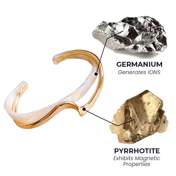 - Pyrrhotite – is a magnetite that has magnetic properties. The Oveallgo™ LeanLine Magnetic Bangle is designed with the unique use of pyrrhotite to harness the power of magnetic therapy. Magnetic therapy realigns the electromagnetic charge in the body’s cells to promote self-healing, which is beneficial to the lymphatic system. The magnetic field heals by alkalizing the tissue and releasing oxygen from its bound state back into the molecular state. It also remarkably reduces swelling of the lymph nodes and reduces 60% excess lymph fluid in consistency.