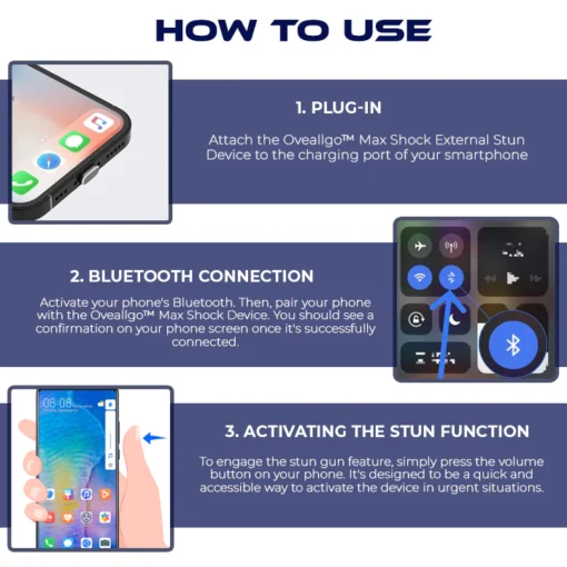- Attach the Oveallgo™ Max Shock External Stun Device to the charging port of your smartphone