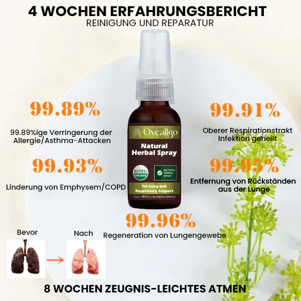 Haben Sie Atembeschwerden aufgrund von Allergien, Asthma, Rauchen, COPD, Lungenentzündung, Bronchitis oder einem geschwächten Atmungssystem ? Oveallgo™ Natürliches Kräuterspray zur Unterstützung der Lunge und der Atemwege gibt Ihnen eine starke Lungenunterstützung . Unsere Formel wurde entwickelt, um Ihre Lungen und Atemwege zu reinigen und alten Schleim und Lungenablagerungen herauszuleiten. Befreien Sie Ihre Atemwege und stärken Sie Ihre Atmung in 8 Wochen, damit Sie wieder frei atmen können . Linderung der Symptome und Folgen des durch das (COVID‑19)-Virus verursachten Lungenhustens