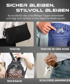 Klein und kompakt – perfekt für alle, die im Freien trainieren oder zu Fuß zum und vom Auto gehen. Wenn Sie nach einem Selbstverteidigungsring suchen, der sowohl klein als auch kompakt ist, sollten Sie den Oveallgo™ 50.000.000 Volt Defender Ring in Betracht ziehen. Es verfügt über ein Paar abgeschrägter Spitzen, die sich weich anfühlen, aber bei der Faust heftig sind. Der Ring ist langlebig und leicht, sodass er schnell getragen werden kann und ununterbrochen sofortigen Schutz bietet. Sie können es problemlos in Ihrer Brieftasche, Halskette oder Ihrem Schlüsselbund tragen.