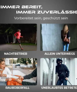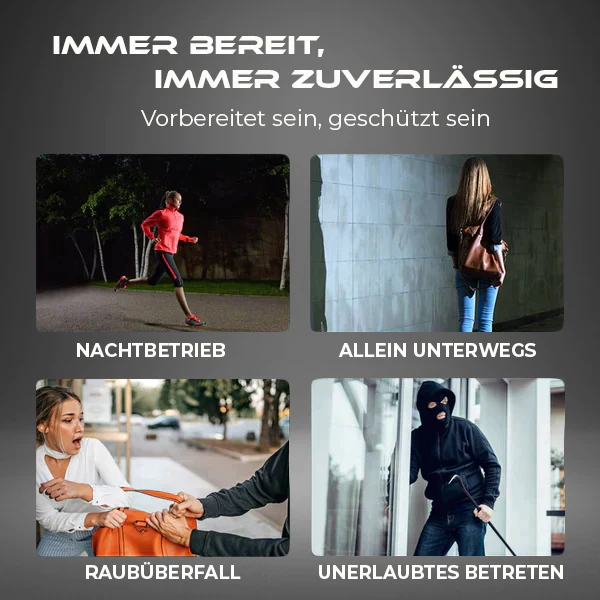 Einfachheit trifft auf Effizienz – Dieser Selbstverteidigungsring kann bei Bedarf einfach mit nur einem Knopf eingeschaltet werden. Damit Sie sich immer bereit fühlen, sich ohne Komplikationen vor allen Gefahren zu schützen, die auf Sie zukommen. Dieses Zubehör ist die einfachste und effektivste Lösung, um Angreifer fernzuhalten.