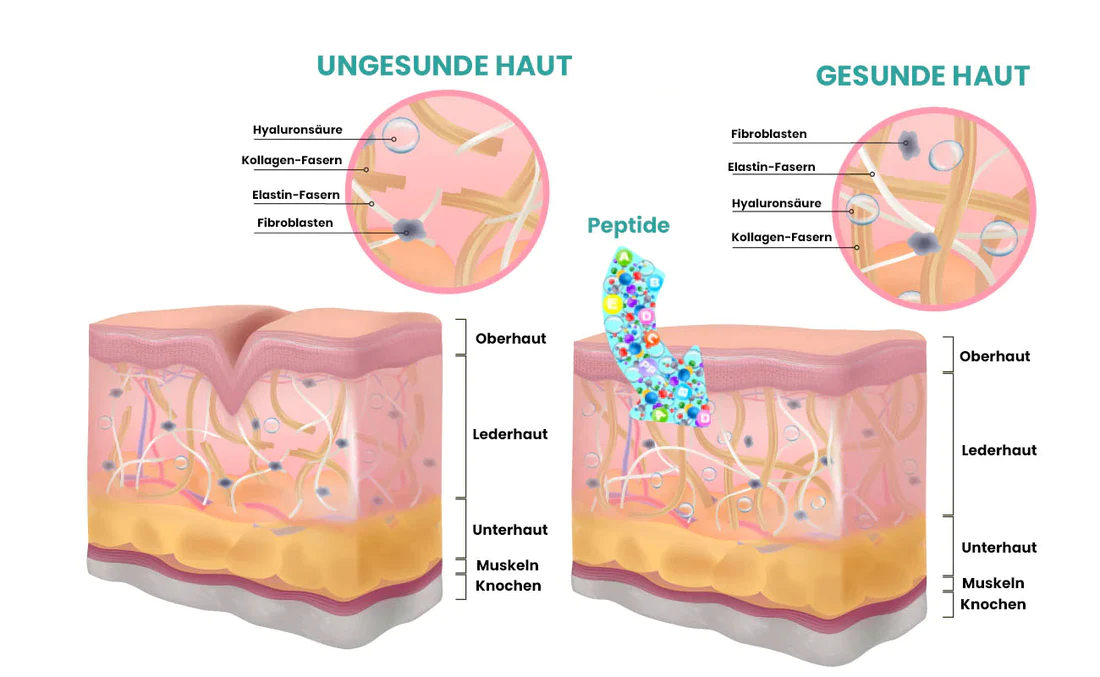 Das Szeged Bioresearch Center (BRC) hat vorgeschlagen, dass Peptide die Regeneration von Kollagen, Elastinfasern und Hyaluronsäure fördern können, den Feuchtigkeitsgehalt der Haut verbessern, die Hautdicke erhöhen sowie feine Linien reduzieren. Man kann sie als Boten für andere Zellen betrachten, die Signale senden, um die Produktion von Kollagen und Elastin zu stimulieren. Copyright possessed by Oveallgo™ Group.