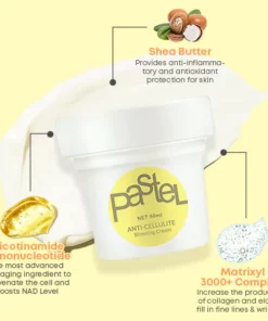 The newest anti-aging ingredients – Nicotinamide Mononucleotide(NMN). It’s the main sources of cellular energy in the human body. Studies have demonstrated that boosting NAD+ synthesis in the body beneficial way to effectively slow down and reverse skin aging and other adverse effects of UV radiation on the skin. PASTEL Anti-Cellulite Slimming Cream contains an unprecedented purity level of 98% (other NMN product won’t disclose their purity levels) directly reaching and affecting the skin, giving it a more youthful look and feel.