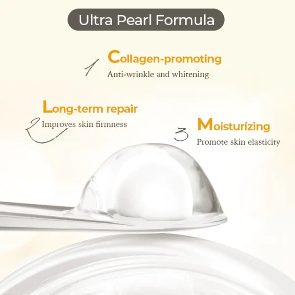 In the Ultra Pearl Formula, each translucent, pearl-like cream contains a perfect proportion of pearl extract for long-term repair. The protein in pearl extract converts to collagen, promoting skin elasticity and moisturizing for smooth, supple, and clear skin.