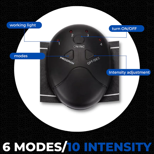6 modes provide different pulse frequencies and pulse modes for different body parts. Each program has 10 intensity levels to meet every need for muscle building. You can easily select a mode and intensity by simply pressing the buttons on the main unit.