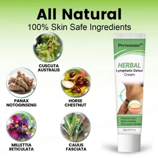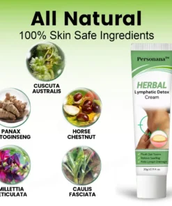 Personana™ Herbal Lymphatic Detox Cream is expertly crafted with a potent blend of natural ingredients designed to directly address lymphatic congestion. Through transdermal delivery, it penetrates deeply into targeted areas to stimulate lymphatic drainage, relieve swelling and pain, and support whole-body wellness.
