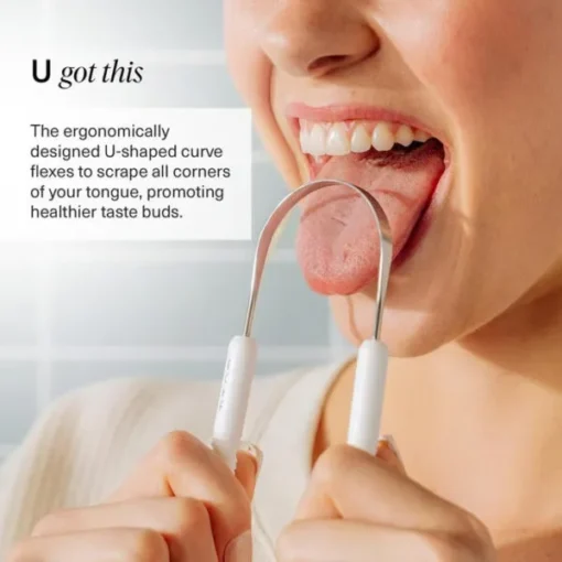 Crafted with ergonomic precision, this tongue scraper is made from high-quality stainless steel, ensuring it’s both safe and durable. The unique ‘U’ shaped curve is designed to reach all the corners of your tongue for a thorough clean, promoting healthier taste buds and enhanced flavor perception.