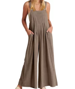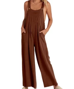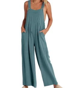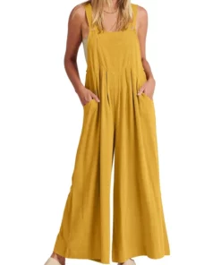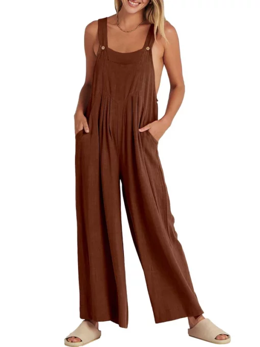 This overalls jumpsuit is designed with adjustable shoulder straps, button detailing, sleeveless style, square neckline, pockets, wide leg pants, is a loose casual fit.
