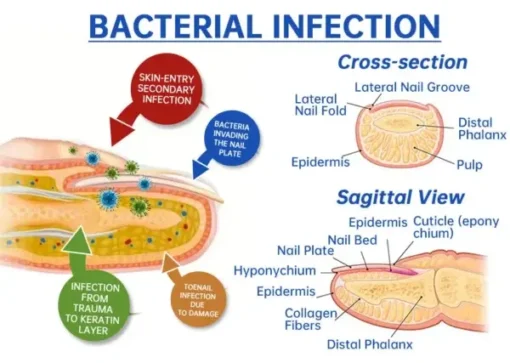 Conditions like paronychia and fungal infections arise when bacteria infiltrate compromised skin near the nail’s cuticle and fold, leading to infections.