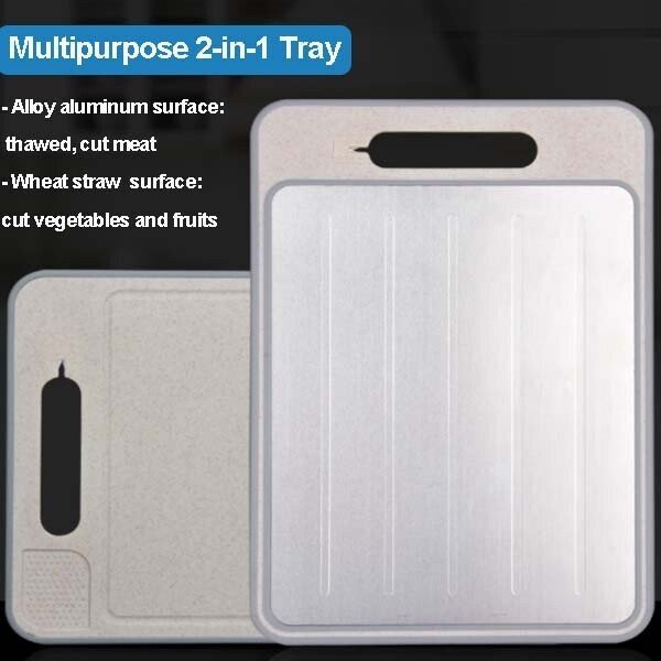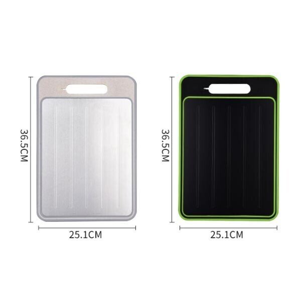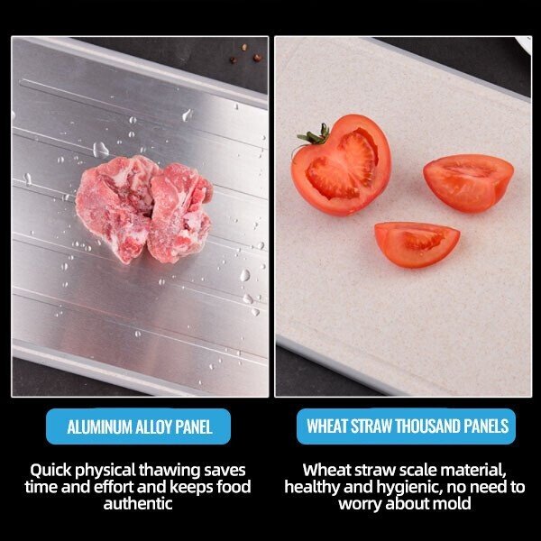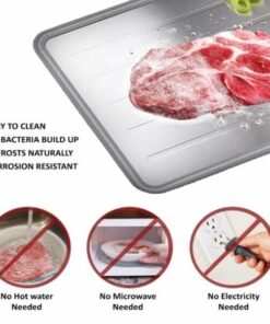 The defrosting tray is made of food-grade aluminum, to thaw frozen food by environmentally friendly transferring heat from room temperature to the frozen food contact area, thus preserving texture and taste without compromise.