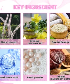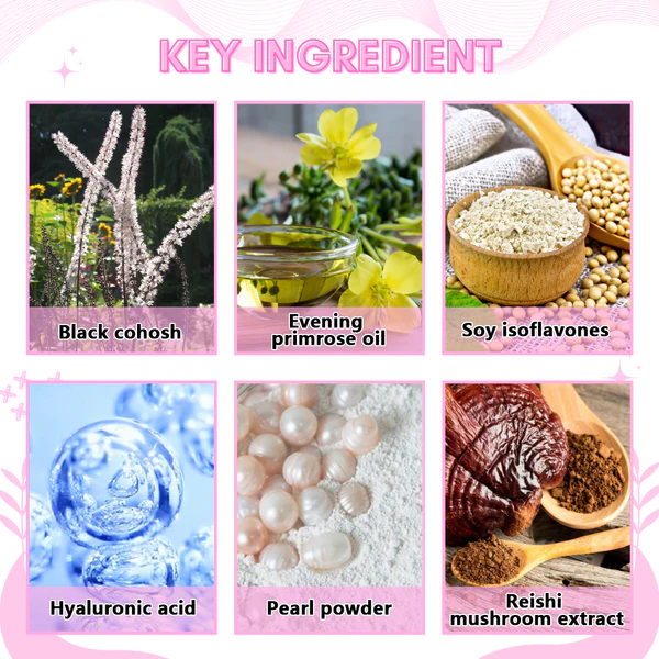 - Main Ingredients: Soy isoflavones, Black Cohosh, Evening Primrose Oil, Pearl Powder, Collagen, Hyaluronic Acid