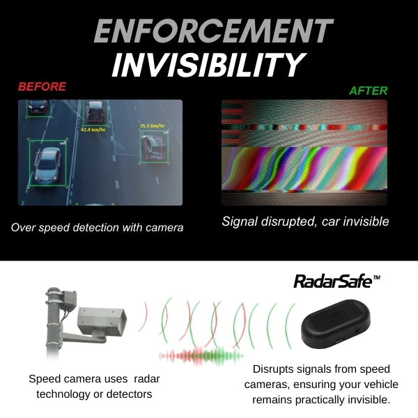 Automated Enforcement Invisibility: Disrupts signals from speed cameras, ensuring your vehicle remains practically invisible. Drive confidently, free from concerns about automated speed enforcement.