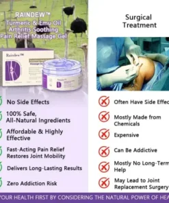 Approved by orthopedic specialists, Raindew™ Turmeric & Emu Oil Arthritis Pain Relief Massage Gel delivers fast relief, soothing pain in just 3 minutes. It restores joint mobility within 3 days and supports full arthritis recovery in just 7 days. Formulated with natural anti-inflammatory ingredients like organic turmeric and pure emu oil, this gel penetrates deeply to reduce inflammation, lubricate joints, and promote long-term healing. Clinically proven and easy to use, it’s the ultimate solution for arthritis sufferers seeking quick relief and lasting recovery.